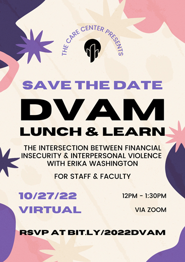Join us in a lunch and learn with Erika Washington and the Care Center of UNLV for increased visibility to the impacts of power-based violence and increased access to trauma-informed and healing-centered services.