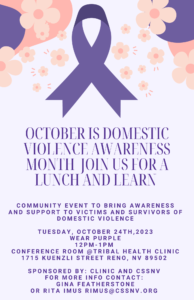 October is Domestic Violence Awareness Month. Join Clinic and Crisis Support Services for a Lunch and Learn to bring support and awareness to victims and survivors of domestic violence. Please wear purple in honor of DVAM.