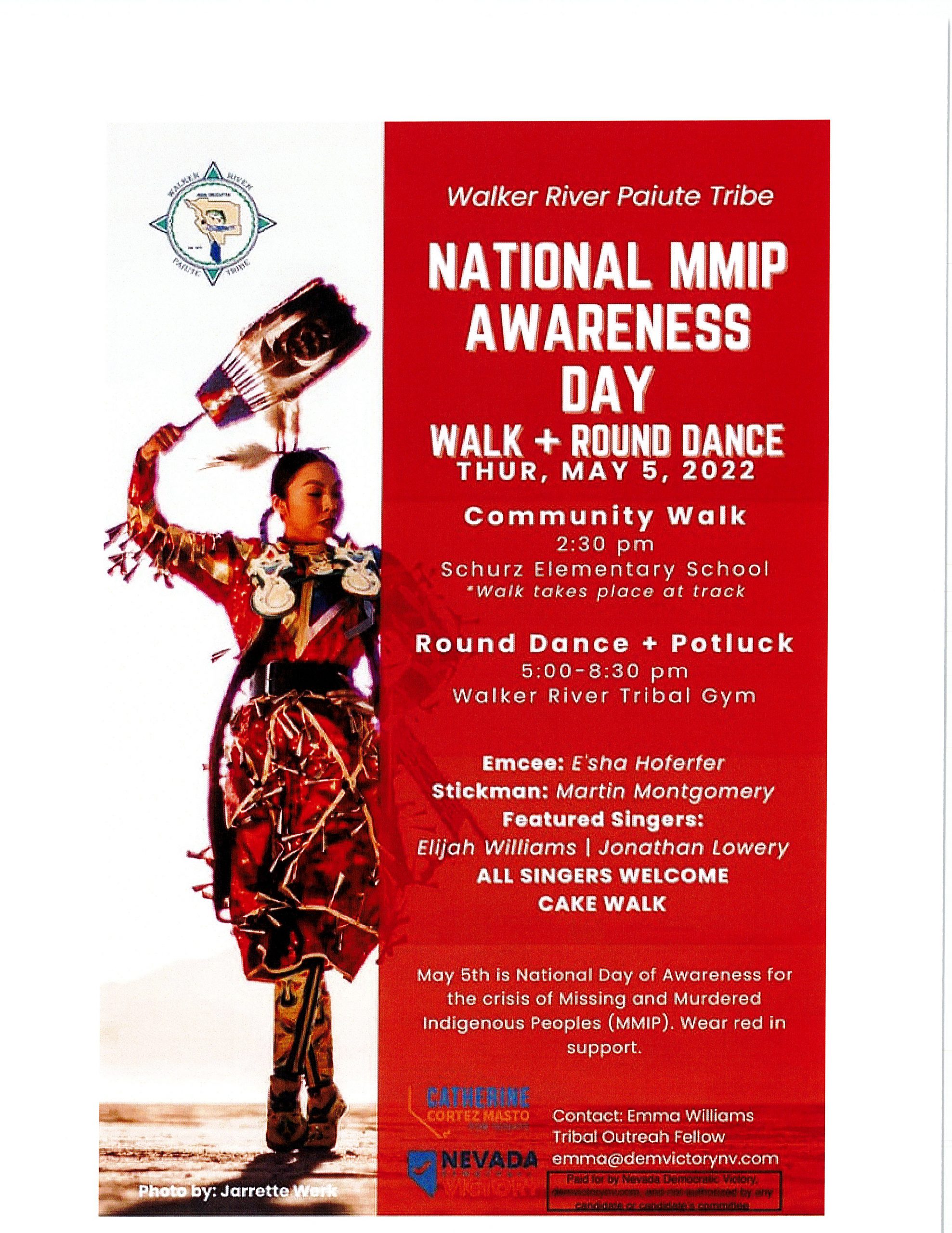 Round Dance + Potluck will take place from 5:00 – 8:30pm at Walker Tribal Gym.