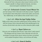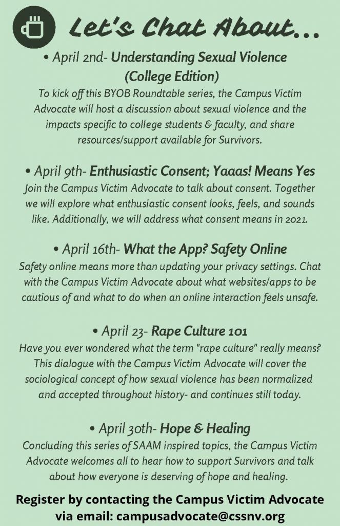 Have you ever wondered what the term “rape culture” really means? This dialogue with the Campus Victim Advocate will cover the sociological concept of how sexual violence has been normalized and accepted throughout history- and continues still today.